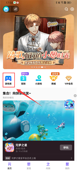 2、进入软件首页,会看到首页有推荐超多好玩的游戏,我们首先点击【游戏库】,如下图所示;