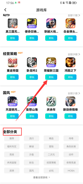 3、进入游戏库会看见有超多的游戏,并且有细致分类,玩家可以快速找到自己感兴趣的游戏,找到喜欢的游戏后,直接点击图标下方的【秒玩】,即可秒玩游戏。
