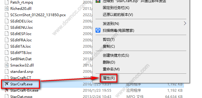 ①进入文件夹“StarCraft”找到文件“StarCraft.exe”。鼠标右键点击“StarCraft.exe”→“属性”