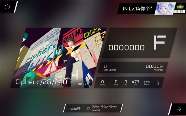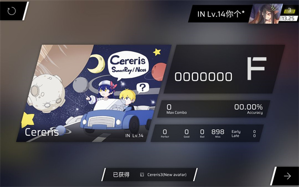 在打完拥有多个头像的曲目后获得头像时,结算界面下方会出现“已获得 xxx+数字(New avatar)”字样,如上图“已获得 Cereris3(New avatar)”,表示你获得了本曲目的第3个头像。