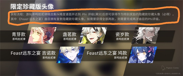 在phigros2.4.7版本中,更新了茶鸣拾贰律精选集,在这个精选集中,除可以无条件获得的头像外,还有5个限定珍藏版头像,如图
