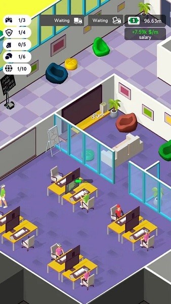 IT公司大亨手游采用了熟悉的经营玩法,不过这一次玩家所要涉足的是it领域,你的目标就是成为这个行业的大佬,首先得建造装修自己的办公室,同时还要招聘更多人才,让他们为你研发出更多新产品,从而为公司赚钱产生巨大的收益。