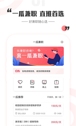 一瓜兼职是一款非常好用的帮助所有的用户都能轻松赚钱的兼职软件,在这里的兼职和招聘信息是比较丰富的,所有的用户都可以轻松的找到比较满意的职位,还有很多的帮助用户找工作的服务可以使用,不管是什么样的职位都是可以找到的。