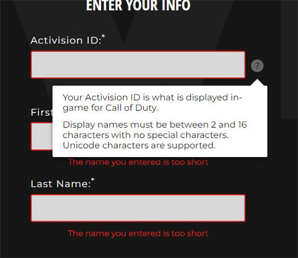 步骤三:自定义2-16位的动视ID并输入姓与名(需要英文格式,不支持中文)