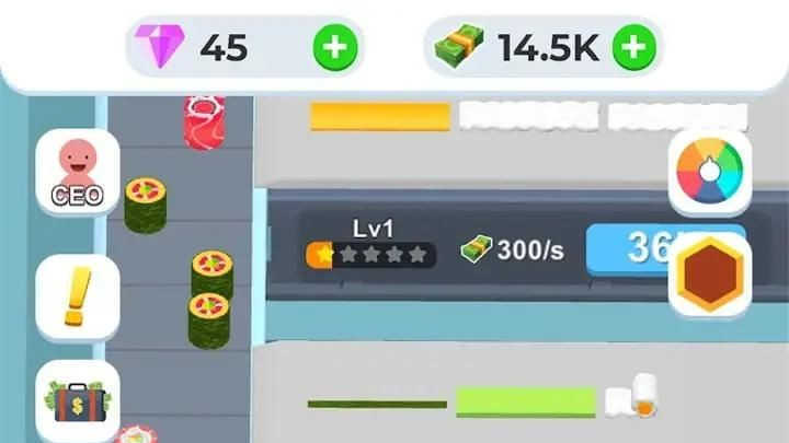 2、丰富的娱乐玩法,升级机器,不断制作寿司,完成订单,扩建工厂,玩法非常有趣;