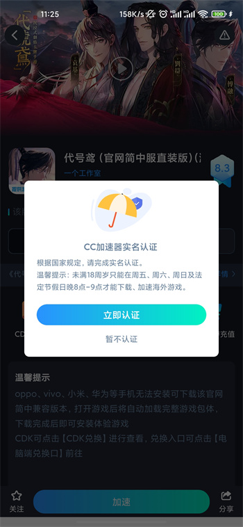 2、加速的过程中可能会收到实名认证提示,按照教程进行认证即可;