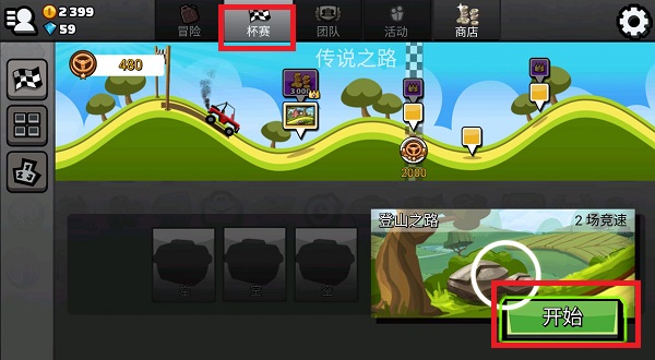 1、在游戏中选择【杯赛】也就是闯关模式,再点击下方的【开始】就可以开启挑战;