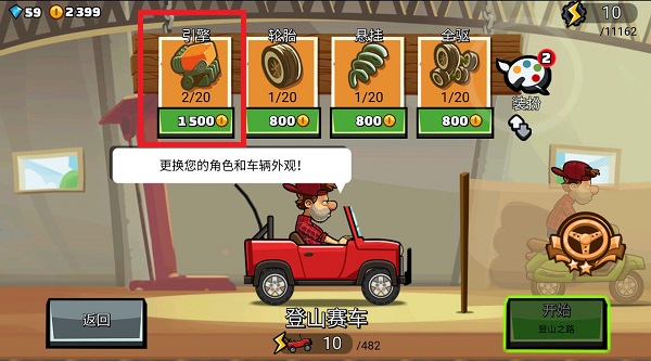 2、在游戏中闯关挑战界面,可以花钱去升级我们的赛车性能,点击想要升级的方面就可以,但是需要足够的金币,点击【引擎】;