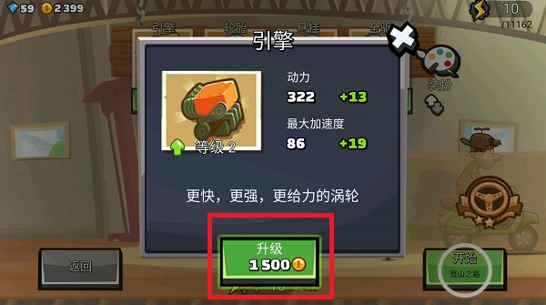 3、在引擎界面就可以点击下方的金币去进行升级;
