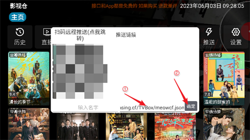 3、接着我们将接口填入①的位置,点击确定,即可完成接口配置,最后大家可以保存配置,并且测试接口是否能够正常工作,可以发送测试请求,返回查看结果。