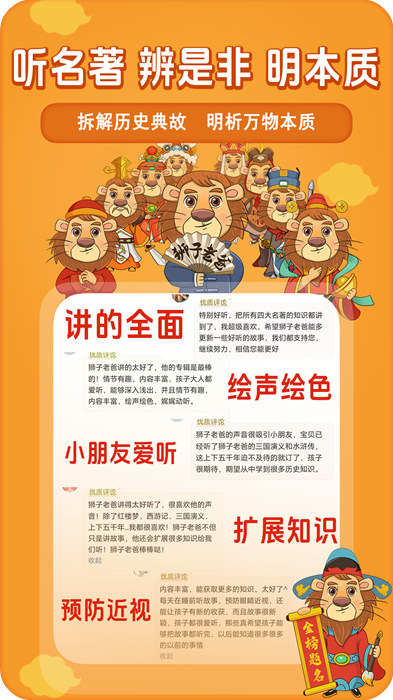 狮子老爸讲故事软件是一款专为儿童打造的故事朗读app,软件内收录了多种有趣的故事,以及生动的动画、音效等多种元素,能够吸引孩子的注意力,帮助他们更好地理解和接受故事中所传递的知识和价值观。
