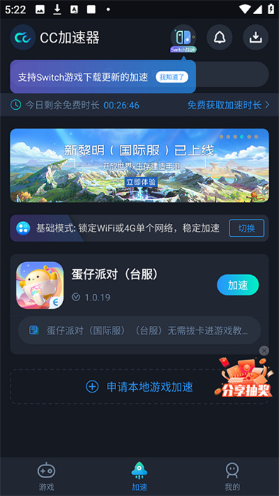 2、然后下载该页面的游戏安装包,打开【cc加速器启动游戏】就可以看到启动蛋仔派对,点击启动;