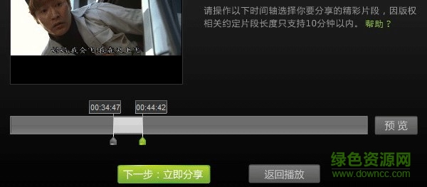 1.拖动A选择你想要分享片段的开始点,拖动B选择你想要分享片段的结束点。因版权约定你分享的视频只支持10分钟以内。