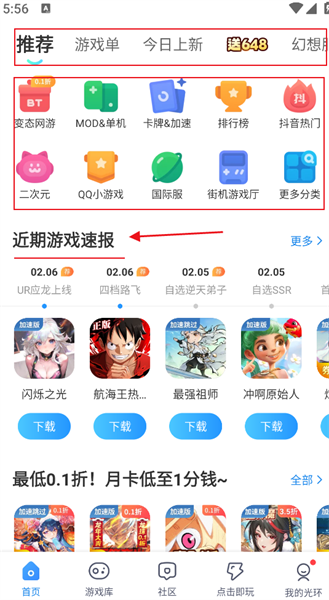 1、首先通过本站下载安装好光环助手APP,在首页清晰的界面提供丰富的游戏资源,上方有各种平台推荐内容以及今日上新的游戏都在这里查看,还有各种游戏分类以及近期的游戏资讯速报,都能第一时间了解;