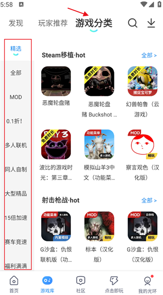 2、点击【游戏库】在游戏分类中给大家将游戏详细分成了超多种类,各种多人联机/同人自制/大型精品等等;
