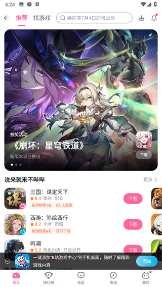 3、进入游戏中心,首页映入眼帘的就是各种推荐的二次元游戏和其他手游,还可以将bilibili游戏中心添加到桌面,随时了解精彩游戏内容