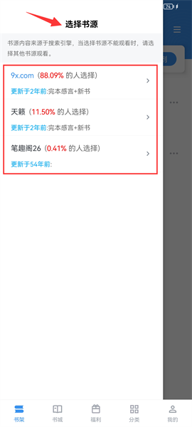 2、选择好书籍后,点击,左侧就会出现一个弹窗,是让用户选择书籍来源,一般都会提供多种不同的来源地址,用户可根据喜好自由选择;