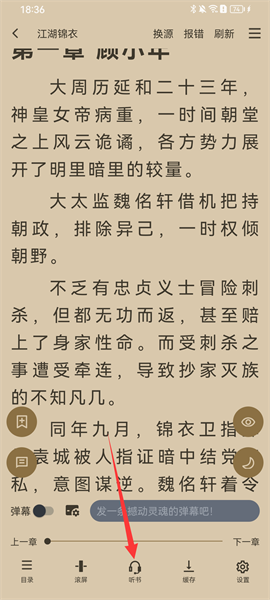 3、书籍来源选择好后,就正式进入阅读界面,需要再次点击屏幕,在底部的小弹窗找到【听书】并点击;