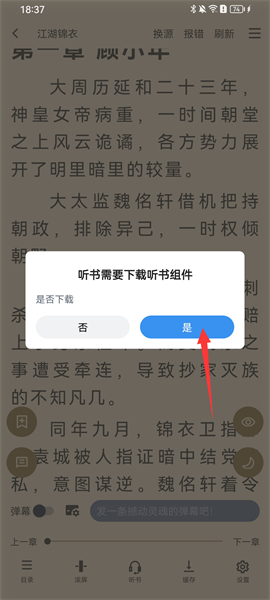 4、随后就会弹出一个需要下载该书的听书组件,我们需要点击【是】等待下载完成后,即可再次进入点击听书即可。