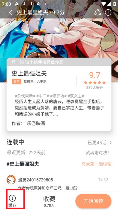 2、作品的页面之中,我们点击左下角的【缓存】就可以去缓存漫画的章节内容;