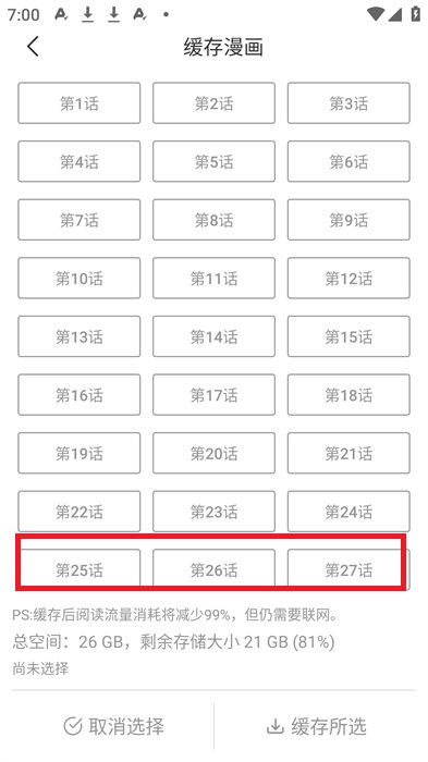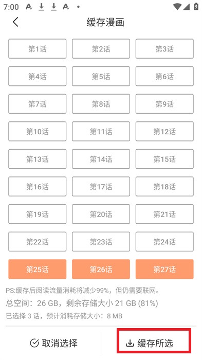 4、选择好所有的想要缓存的章节之后,我们就可以点击下方的【缓存所选】去进行缓存下载。