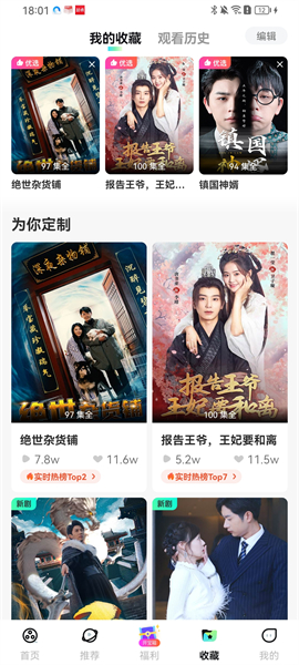4、点击收藏页面,在我的收藏中就可以看见平时收藏的短剧信息,点击观看历史,可以随时查看自己看来哪些内容;