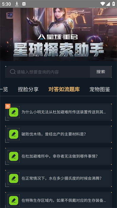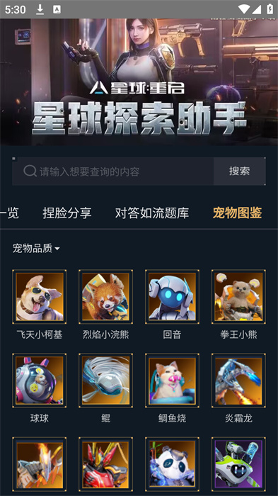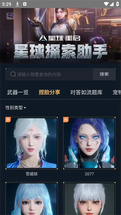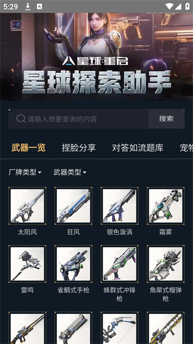 1、软件中分为四个栏目,分别是武器库、捏脸数据、答题库、宠物图鉴,在的对应的频道可以看到不同的内容;