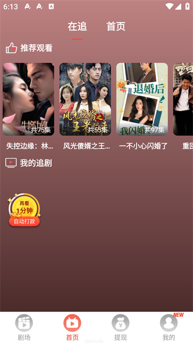 4、【在追】栏目中,就是我们看过的所有作品的集合,能够在这里看到所有正在追的短剧内容。