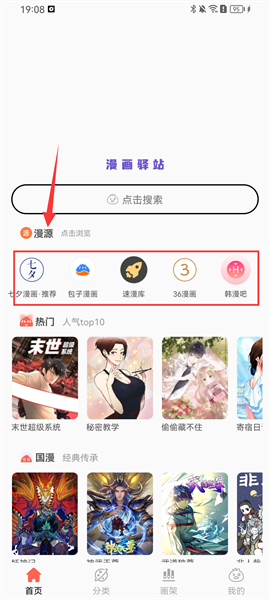 1、首先通过本站下载安装好漫画驿站APP,点击进入软件首页,首页有提供不同的漫画来源平台,用户可以一键自由切换;