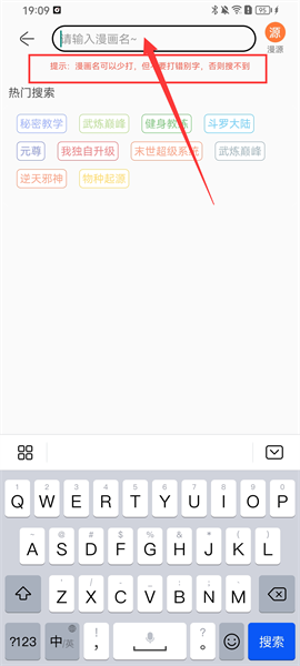 2、点击搜索框,可以直接输入想看的漫画名称,注意:此处漫画名称可以少打,但是绝对不能打错别字,否则会导致搜不到或者漫画不一致;