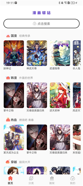 3、软件将所有的漫画进行了细致的分类,有国漫/韩漫/穿越等不同国际不同题材;