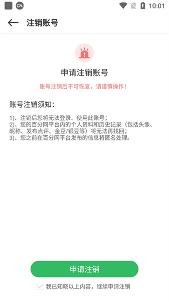 3、在注销账号页面中需要注意:账号注销后不可恢复,仔细阅读了解账号注销须知详情后,将屏幕最下方的知晓以上内容勾选;
