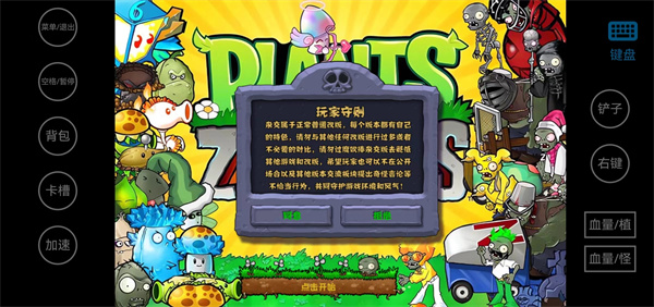 2、在等待加载之后,我们就可以进入到模拟器,就可以进入到植物大战僵尸杂交版的主界面,在主界面中点击【同意】条款,然后点击【开始】就可以进入到游戏界面;