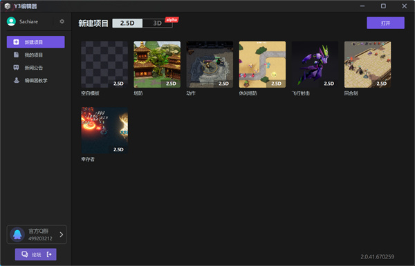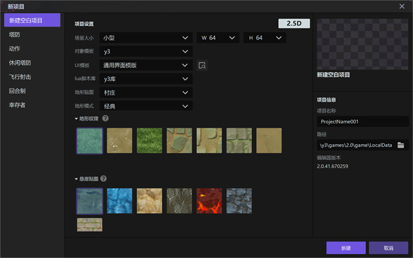 1、打开编辑器就可以进入到【新建项目】界面,在界面中我们可以选择【2.5d、3d】两种模式,点击【空白模版】就可以进入到创建项目详情页中;