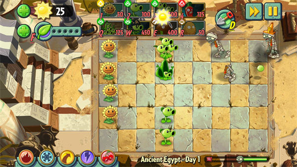 3、游戏进行时,按a键可收集阳光、金币钻石,其他有标识 对场上的植物在适当的时机右键,可以播放浇水动画 对场上的植物鼠标中键,可以触发叶绿素效果 叶绿素可用于取消卡槽冷却