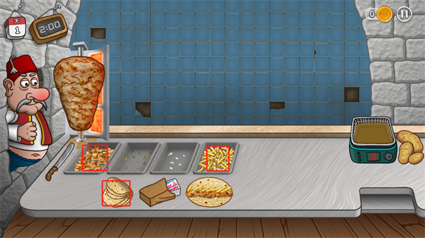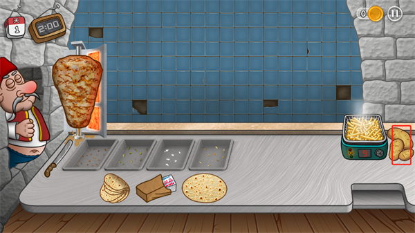 4、点击屏幕之中的小饼图案,并随后点击屏幕中的薯条以及肉片,以完成沙威玛的制作。