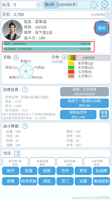 3、屏幕之中人物的修为以及战斗经验会随着时间自动变化,当绿色进度条全填充满之后,玩家需要点击“渡劫”按钮以开启渡劫;