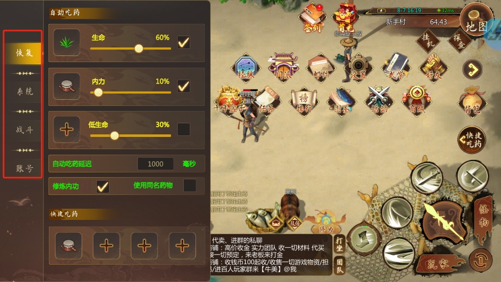 面对广阔的武侠世界的大陆中不断探索,在副本中进行作战将会获得珍稀物品;