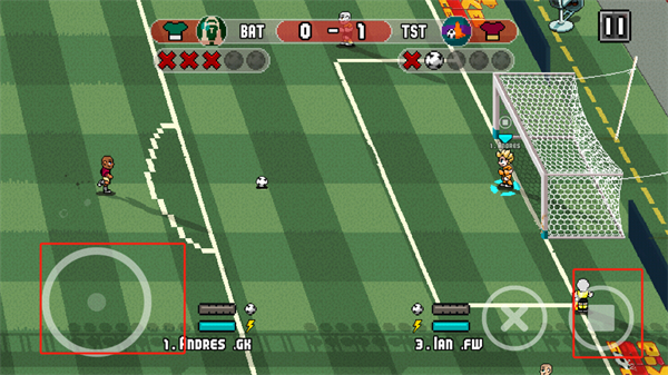 4、如在上一步点击【点球教程】之后,将会出现下图的演示页面,左边的按钮为角色的移动按钮,而右边的红色框框内按钮则为踢球按钮。
