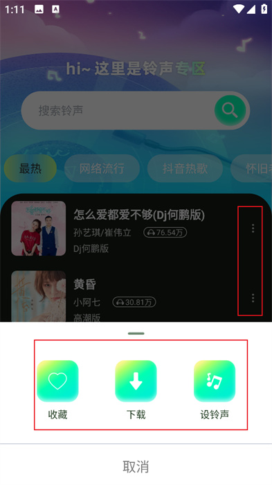 4、最后,点击音乐后面的三个点,就能弹出下载和保存的按钮,如下图所示,这样设置铃声就完成啦。