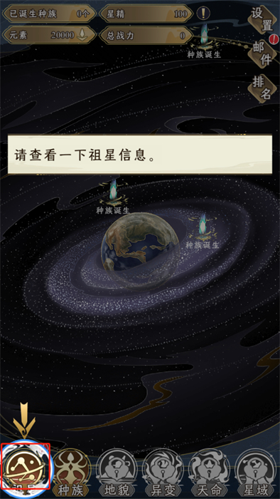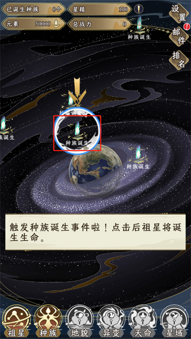 4、至此玩家将可以开启种族诞生计划,点击屏幕中央的【种族诞生】标志即可触发种族诞生;