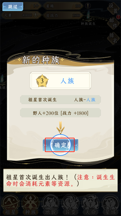 5、当对应的种族诞生之后,玩家进行【确认】按钮的点击即可。