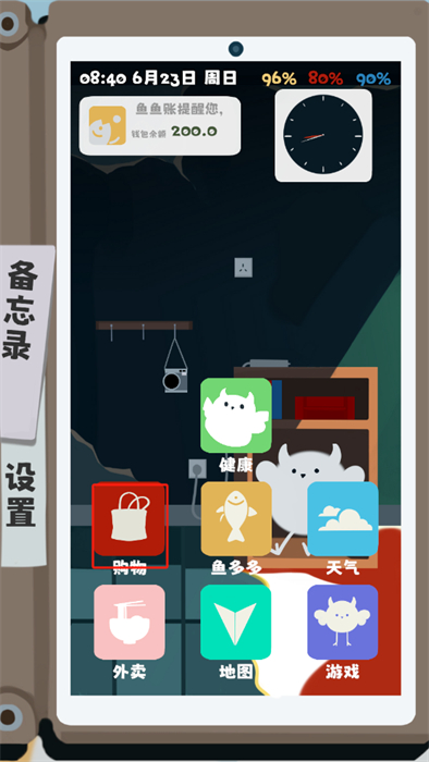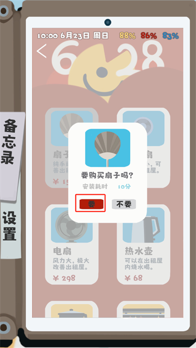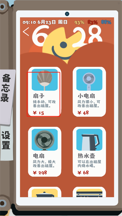 4、当身体状态不佳时,玩家可以在【购物】标志内进行电风扇或者是扇子的购买;