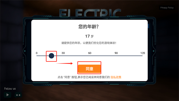 1、进入到场景内之后,玩家将需要通过滑动屏幕中的黑色小按钮来进行年龄的选择,选择好之后进行【同意】按钮的点击即可;