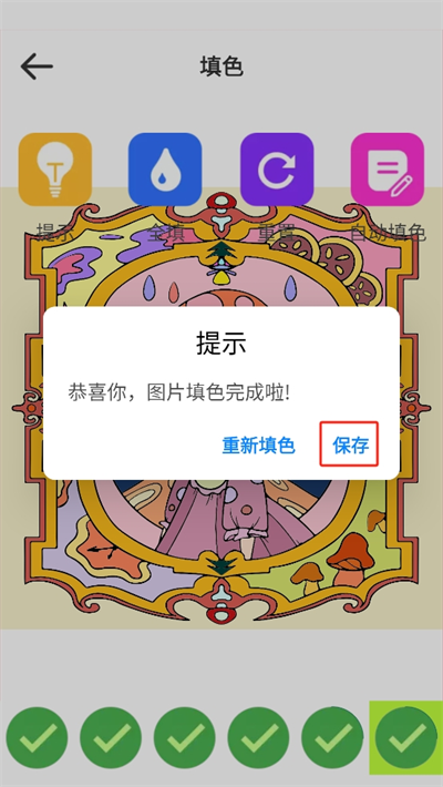 5、上色完毕后会弹出弹窗恭喜你完成图片的填色,我们可以选择保存图片查看填色的结果。