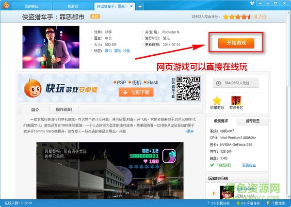 快玩游戏盒子安装后直接点找游戏,找自已想要的游戏,游戏类型有单机游戏、网页游戏、网络游戏、小游戏及安卓游戏。