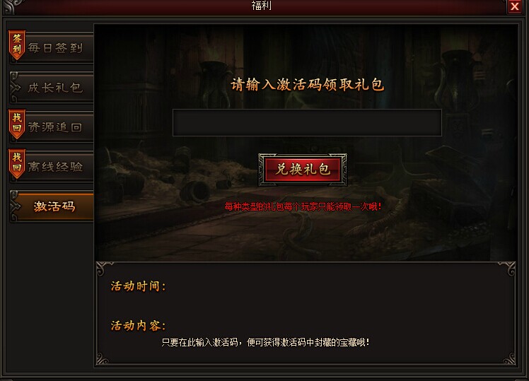 2、在”激活码“处复制粘贴您的序列号,即可领取礼包
