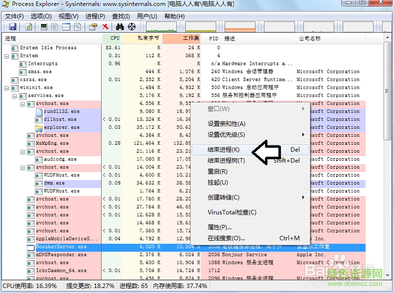 6.若电脑很卡,可以使用Process Explorer查看正在运行的程序,结束进程即可。
