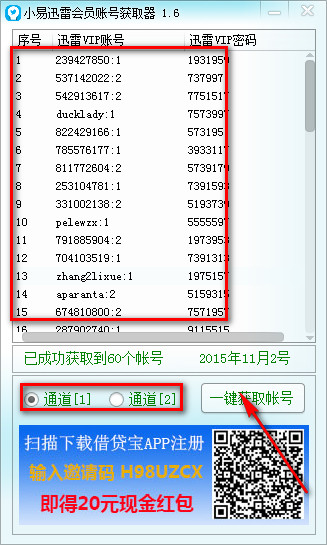 小易迅雷会员账号获取器(迅雷账号获取工具)是一个由小易网友制作的迅雷会员账号获取工具。小易迅雷会员账号获取器包含迅雷VIP帐号近百个,每天都是最新的以确保帐号的有效性,软件打开后点击一键获取,就能获取到VIP帐号和密码了,有时可能要等待几秒后才能获取到,获取速度由网速决定,获取后可以用鼠标选中列表右击复制帐号或密码,当获取不到帐号时可以更通道重新获取即可!