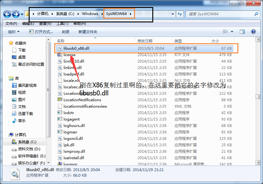 这段话的意思是说,如果系统是64的,你需要去x86 的文件夹,复制libusb0_x86.dll 去c:\Windows\syswow64\ (说明:32位系统,请将文件复制去Windows\system32\), 然后把复制过去的libusb0_x86.dll 的名称换为libusb0.dll